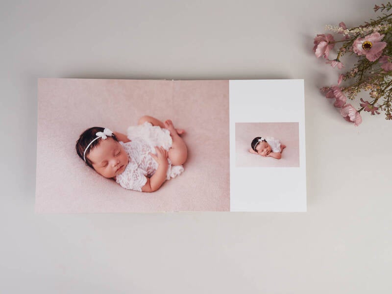 Vlakliggende spreads, verrijkt met dikke 800 gsm of optioneel 1600 gsm spacers — een platliggende pracht waar je vingers zachtjes over willen blijven glijden.